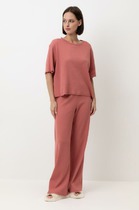 Брюки прямого кроя со средней посадкой удобно сидят на фигуре благодаря широкому поясу с эластичной тесьмой. Все срезы изделий тщательно обработаны, что подчеркивает внимание к качеству исполнения. Мягкий хлопковый материал с добавлением эластана нежно облегает тело, позволяя коже дышать, и сохраняет форму даже после стирок. Этот комплект станет воплощением домашнего уюта, где каждая деталь продумана для вашего расслабления и прекрасного самочувствия.