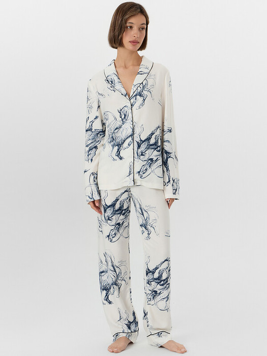 Домашний комплект с художественным узором лошадей, выполненным в стиле карандашного рисунка, создан для ценителей уюта и эстетики. Пижама из жакета и брюк выполнена из вискозы — этот материал отличается особой мягкостью и шелковистой гладкостью, обеспечивающей невероятный комфорт при соприкосновении с кожей. Вискозный трикотаж обладает превосходной воздухопроницаемостью, поддерживает идеальный температурный баланс тела в течение всей ночи.