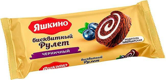 Шоколадный рулет из пышного бисквитного теста с нежной кремовой прослойкой и ароматной начинкой из черничного джема. Бисквитный рулет украшен глазурью.