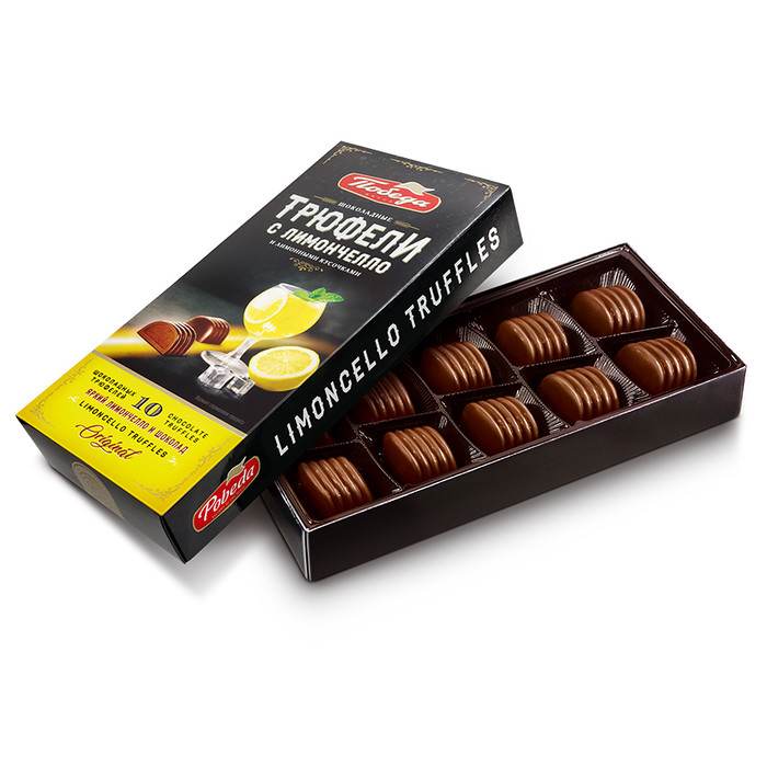 Состав: шоколад (сахар, тертое какао, масло какао, сухое цельное молоко, сыворотка молочная сухая, какао-порошок, пахта сухая, эмульгатор (лецитин соевый), ароматизатор (ванилин)), жир растительный, сахар, какао-порошок, лимонные кусочки, сыворотка молочная сухая, сухое цельное молоко, ликер Лимончелло, спирт, ароматизатор натуральный ("ликёр лимонный"), эмульгатор (лецитин соевый), ароматизатор (ванилин).