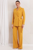 Спортивный молодежный костюм из футера, состоящий из брюк с лампасами на манжете и укороченного свитшота до талии. Свитшот разрезной, из трех цветов ткани, с декоративной корсажной лентой, с воротником-стойкой, на молнии. Рекомендуется ручная стирка при 30 градусах.