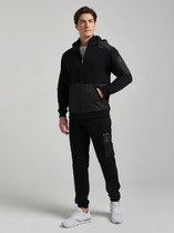 Мужской костюм. Кофта на молнии без капюшона, по бокам карманы. Рукава на манжете. Слева на груди вышивка в виде небольшой надписи. Брюки прямые. Спереди два кармана. Слева под карманом вышивка в виде небольшой надписи.