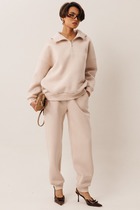 Комплект состоит из кофты и брюк. Кофта прямого силуэта, с округлой горловиной, по рукавам и по низу кофты - широкие манжеты. Брюки свободные, на поясе, с декоративным шнурком черного цвета. Обработка карманов у брюк - отстрочка 0,5 см.