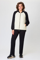 Костюм с брюками, спортивного типа. По бокам брюк лампасы молочного цвета. Брюки с карманами, в пояс вдет шнурок. По низу брюк черные манжеты с принтом. Кофта приталенного силуэта, по низу и на рукавах черные манжеты с принтом. Горловина обработана окантовкой.