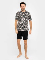 Удобный мужской костюм с шортами из натуральной хлопковой ткани. Приятен к телу и не стесняет движений. Футболка прямого кроя  с V-образным вырезом. Шорты средней длинны с боковыми карманами. Пояс изготовлен на поясной машине.