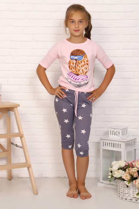 Костюм из кулирки - кофта и бриджи. Кофта свободного покроя с печатью, 3/4 рукав с манжетом, горловина окантована, низ затягивается на шнурок. Бриджи с манжетами