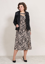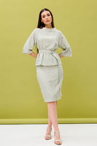 Комплект состоит из футболки и брюк. Брюки на эластичном поясе, с карманами, с лампасами вдоль боковых швов. Спереди по шву притачивания пояса заложены складки. Футболка прямого силуэта, с асимметричным низом и обработанным разрезом в нижней части удниненного бокового шва. На полочке расположены симметричные кокетки. Горловина обработана обтачкой. Рукав цельнокроеный короткий, обработанный бейкой из основного полотна.
