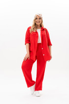 Трикотажный женский костюм из структурной ткани. Жакет прямого силуэта переду центральная застежка на 3-и петли и пуговицы и потайные кнопки. По переду накладные карманы декорированные цепью и застежкой на петлю и пуговицу. Спинка со средним швом без особенностей. Рукава втачные двухшовные. Юбка прямая длиной миди без подкладки. По правому боковому шву разрез. Для максимально комфортной посадки по поясу эластичная резинка.
