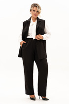 Тренд сезона, брючный джинсовый костюм. Жакет курточного типа комбинированный с капюшоном. Рукав на спущенной пройме с расстёгивающейся манжетой по низу. По переду накладные карманы и кокетка. Застежка центральная на кнопки. Спинка без особенностей. По низу кулиса. Брюки, прямые от бедра с широкой манжетой по низу. По переду вблизи боковых швов карманы. Для максимально комфортной посадки по поясу вставлена эластичная резинка. Длина жакета 65 см, длина рукава от горловины 75 см, длина брюк 109 см.