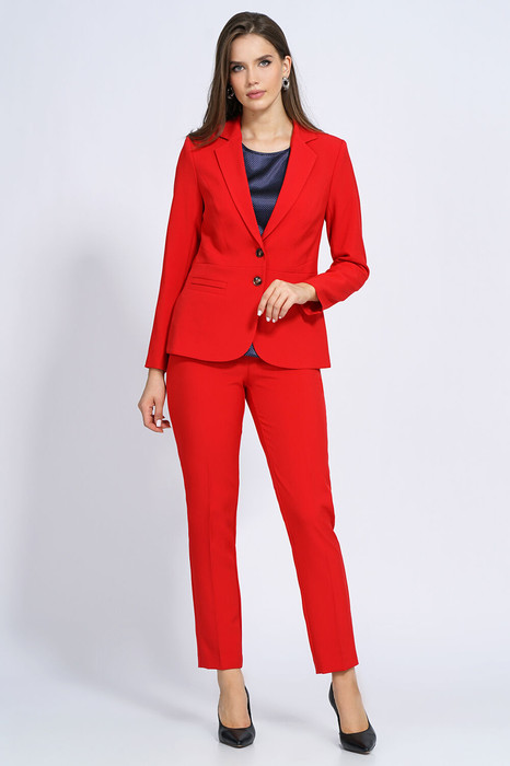 Жакет полуприлегающего силуэта, отрезной по линии талии с центральной застежкой на две петли и пуговицы. Верхняя часть переда с рельефными швами и конструктивным подрезом, нижняя часть с прорезными карманами. Спинка со средним швом и рельефными швами в верхней части. Рукава втачные, двухшовные. Жакет на подкладке и с плечевыми накладками. Блуза прямого силуэта без воротника, с фигурной линей низа. Горловина обработана окантовочным швом. Перед с нагрудными вытачками. Рукав – крылышко. Брюки длинные со сгибом, на притачном поясе с пятью шлевками. Застежка спереди на тесьму-молнию и одну петлю и пуговицу. Передние части с имитацией косых боковых карманов. Задние части с талиевыми вытачками. Р52, 54, 56 пояс с резинкой по боковым швам.