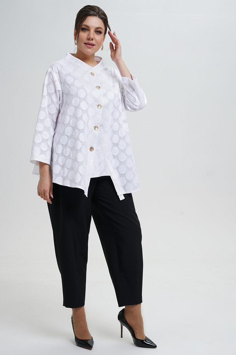 Блузка свободного А- образного силуэта, с ассиметричной застёжкой на петли, пуговицы, с фигурным разноуровневым низом. Перед понизу левой части с кулисой и завязкой. Спинка с рельефными швами. Рукава втачные, одношовные, длиной 7/8. Воротник стойка.