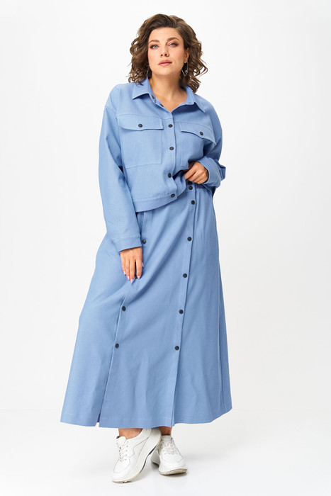 Элегантный женский костюм, состоящий из жакета и юбки, выполнен в приглушенном голубом цвете, добавляющем изысканность образу.