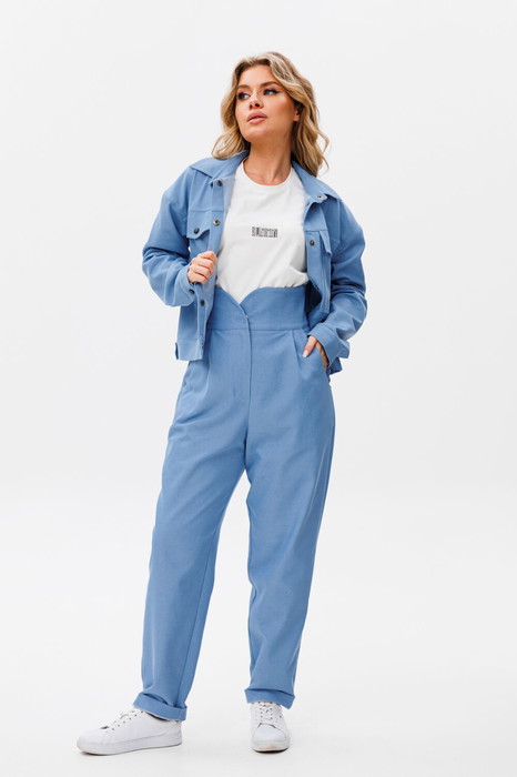 Джинсовый жакет свободного силуэта с застежкой по переду на кнопки. Воротник отложной. По переду отрезные кокетки,накладные карманы с клапанами. По спинке кокетка и рельефы. Рукав двухшовный с притачной манжетой на кнопках. Низ жакета на притачном поясе.