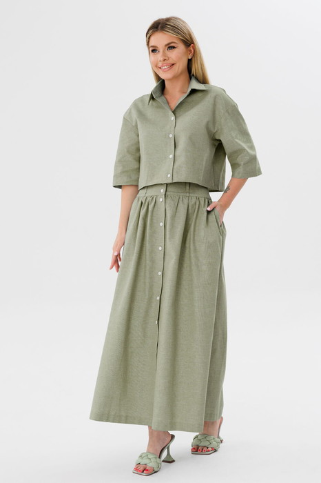 Юбка женская А-силуэта на широком поясе. По переду вертикальная застежка на пуговицы. В боковых швах действующие карманы.