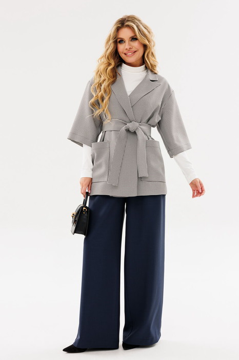 Жакет женский свободного силуэта со спущенным плечом. Рукав короткий.По переду накладные карманы. Жакет на без подкладки,с поясом из основной ткани.
