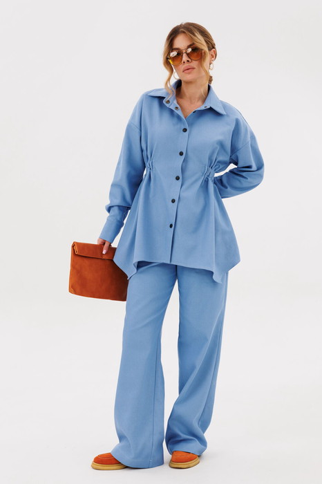 Рубашка женская А-силуэта приталенная за счет резинки на кулисе. Застежка по переду на кнопки. Рукав длинный на манжете. Низ фигурный.