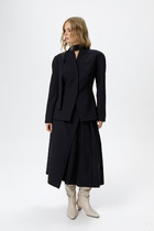 Костюм женский с брюками выполнен из костюмной ткани. Жакет полуприлегающего силуэта на подкладке, по полочке обработаны рельефные швы и в области талии прорезной карман листочка. Воротник пиджачного типа, застежка центральная на петли и пуговицы. Спинка со средним швом и рельефами. Рукав втачной двухшовный в локтевом шве рукава обработана имитация шлицы с пуговицами. Брюки прямого силуэта, верхний срез брюк на притачном поясе с эластичной тесьмой, в боковых швах карман с отрезным бочком.