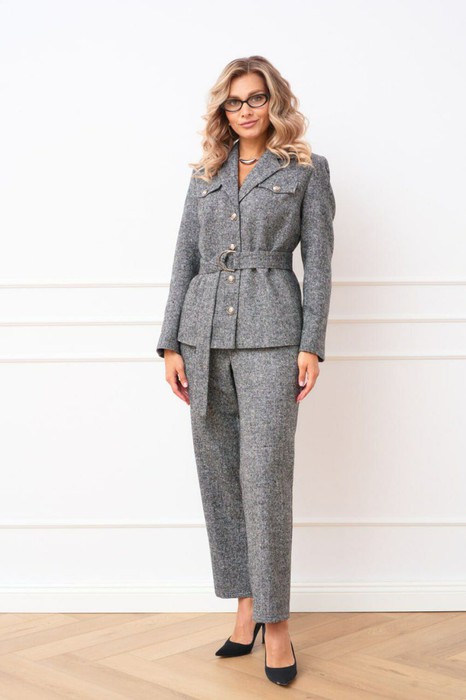Костюм женский состоящий из жакета и прямых брюк, зауженных к низу. Жакет прямого силуэта с воротником пиджачного типа и центральной застежкой на петли и пуговицы. По полочке обработана кокетка, в шов которой вставлен отделочный клапан. В шве рельефа обработан карман. Рукав втачной, двухшовный. Спинка со средним швом и рельефами. Верхний срез обработан притачным поясом по задним половинкам для лучшей посадки вставлена резинка, застегивающийся на петлю и пуговицу, застёжка центральна с гульфиком и откоском на тесьму молнию, в боковых швах обработаны функциональные карманы с отрезным бочком. Костюм дополнен съёмным поясом из основной ткани застегивающийся на пряжку-протяжку.