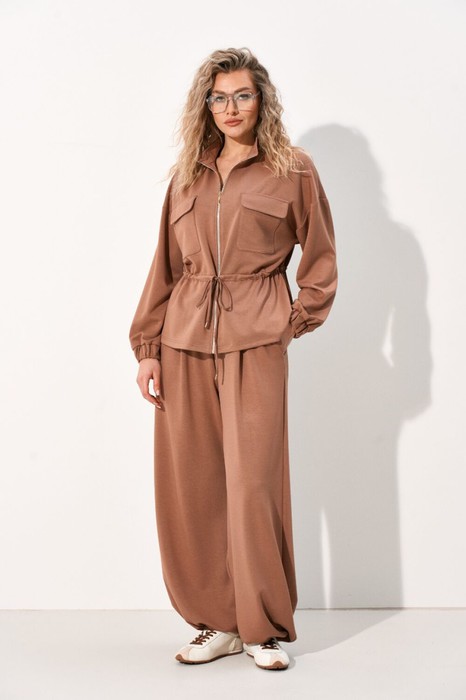 Костюм женский спортивный выполнен из нежного трикотажного полотна что обеспечит максимально комфортную посадку по фигуре. Костюм состоит из джемпера полуприлегающего силуэта и брюк прямого кроя. Джемпер с центральной застёжкой на тесьму-молнию, воротник-стойка, по полочке в области груди настрочены накладные карманы с клапаном, по талии обработана кулиса, что позволяет регулировать посадку джемпера по фигуре. Рукав втачной, линия плеча чуть спущена по низу притачная манжета с эластичной тесьмой.