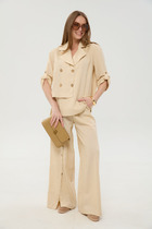 Комплект женский состоящий из бомбера и брюк. Брюки выполнены из смесового волокна льна и вискозы благодаря чему отлично садятся по фигуре и обеспечивают износостойкость. Крой брюк прямого с элегантным запахом по передним половинкам, в боковых швах обработан карман с отрезным бочком, в среднем шве застёжка на тесьму-молнию. Верхний срез обработан поясом кокеткой, застёгивающийся на потайные пуговицы и фиксирующийся завязками из ткани.