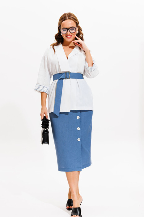 Комплект женский 2-предметный (жакет и юбка) из текстильной ткани - идеальный вариант на жаркую погуду.  Жакет прямого силуэта, со спущенным плечом. Воротник - ассиметричный: апаш и шалевый. Рукав 3/4 длины, с отложной манжетой из отделочной ткани. Застежка - на запах, фиксируется съемным поясом. Юбка однотонная  зауженная к низу, по полочке по линии колена - складка, переходящая в шлицу. Отделка в виде пуговиц. По спинке: средний шов, молния, пояс отрезной с резинкой.  Длина спинки (жакет)- (50-54)-68см, (56-60)-71см.  Длина рукава: (50-54)-40 см, (56-60)-42см. Длина юбки 75см