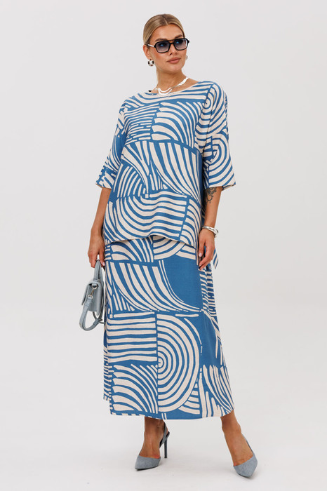 Костюм женский 2-хпредметный (платье, блузка) из текстильной ткани с абстрактным принтом станет акцентным дополнением к вашему гардеробу. Отлично подойдет как для повседневной носки (работа, офис, прогулки), так и для праздничных выходов. Достаточно дополнить его соответствующими аксессуарами. Предметы комплекта легко будут сочетаться с вещами из Вашего гардероба. Блузка со спущенным плечом, трапециевидного силуэта с разрезами по бокам. Платье-макси трапециевидного силуэта на фиксирующих брителях. По полочке идет грудовая выточка из бокового шва. Длина по спинке ( платье ): (50-54)117см, (56-58)-119см. Длина по спинке (блузка) (50-54) - 66 см, (56-58) - 70 см. Длина рукава: (50-58) - 22 см