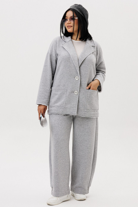 Костюм женский кэжуал (casual) из трикотажного материала трехнитка  свободного кроя, который создает расслабленный силуэт -это отличный выбор для активных и стильных деушек и женщин,  которые ценят моду и комфорт! Жакет со спущенным плечом. Воротник пиджачного типа, по полочке идут накладные карманы. Жакет без подкладки, мягкий и легкий. Края борта воротника, низов и карманов не обработаны. Застежка на петли и пуговицы. Выполнен в крое Oversize свободной формы и посадкой по фигуре. Если хотите силуэтную посадку, выбирайте на размер меньше. Если хотите посадку свободнее - заказывайте свой размер.