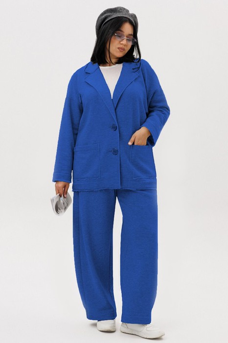 Костюм женский кэжуал (casual) из трикотажного материала трехнитка  свободного кроя, который создает расслабленный силуэт -это отличный выбор для активных и стильных деушек и женщин,  которые ценят моду и комфорт! Жакет со спущенным плечом. Воротник пиджачного типа, по полочке идут накладные карманы. Жакет без подкладки, мягкий и легкий. Края борта воротника, низов и карманов не обработаны. Застежка на петли и пуговицы. Выполнен в крое Oversize свободной формы и посадкой по фигуре. Если хотите силуэтную посадку, выбирайте на размер меньше. Если хотите посадку свободнее - заказывайте свой размер.