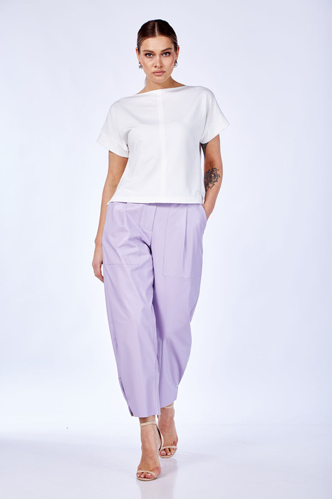 Комплект женский 2-х предметный (топ и брюки). Топ прямого силуэта из трикотажного полотна со спущенным плечом, по бокам разрезы, спинка длиннее чем полочка. По центру полочки и спинки - отделачная строчка. Рукав в виде манжены, вырез горловины в форме лодочки. В качестве отделки по низу полочки - нашивка. Брюки бананы из Эко-кожи. Укороченные, сужающиеся к низу за счет встречной складки. По переду идут подрезные карманы и складка по линии талии. Застежка на молнию. Пояс отрезной с резинкой. Топ и брюки можно легко совмещать с другими предметами вашего гардроба. Длина спинки(46-50)-55 см, (52-54)-58см. Длина рукава (манжета): (46-54)-4 см. Длина брюк: (46-50)-94см, (52-54)-96см.