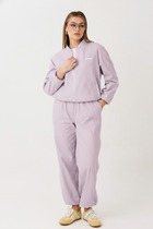 Брюки со стрелками, зауженные к низу. По передним половинкам выполнены наклонные карманы и складки по талии. По задним половинкам обработаны талиевые вытачки. В среднем шве передней половинки брюк обработана застежка на молнию. Брюки на притачном поясе с эластичной тесьмой и застежкой на петлю и пуговицу. По низу брюки с цельнокроеной отложной манжетой.