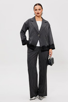 Комплект состоит из блузки топа и брюк. Блузка выполнена из однотонного креп-шифона, топ выполнен из блузочной однотонной ткани, брюки выполнены из однотонной струящейся ткани, контрастной по цвету.