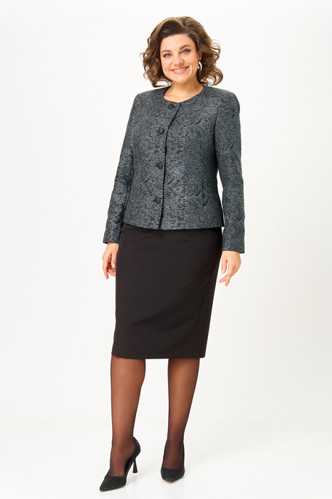 Комплект состоит из жакета и юбки. Выполнен из пестротканого трикотажного полотна. Костюм на подкладке.