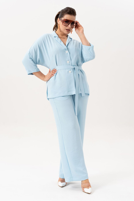 Костюм женский  тройка,  на  любые  мероприятия,  состоящий из  жакета ,брюк и топа. модный соременный. Жакет с воротником пижачного пита, с центральной бортовой застёжкой на 3 петли и 3 пуговицы, полочка с нагрудной вытачкой, с рарзезами по бокам. жакет со сьёмным поясом. Спинка цельная. Брюки женские    прямого кроя, на притачном поясе   с резинкой.. Передние половинки  с   карманами в швах.   Топ прямого силуэта с нагрудными вытачками и с разрезами по боковым швам. Блузка-топ с регулирующей  длину бретелек фурнитурой.