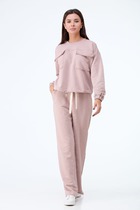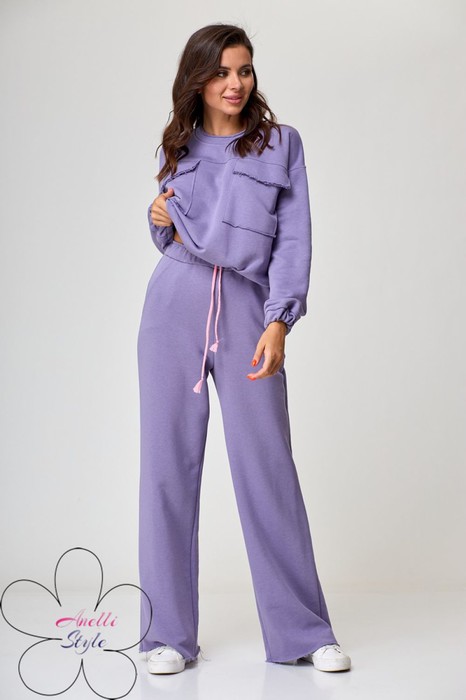Брюки прямые посадка на талии, на эластичном поясе с резинкой внутри, обработаны боковые карманы. Изюминкой комплекта являются открытые срезы, добавляющие небрежного шика образу. Выполнен в нескольких оттенках.