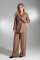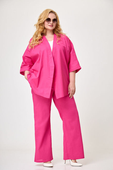 Костюм женский из льна. Кимоно оверсайз, длиной до середины бедра. Рукав 3/4, низ широкий на манжете, без застежки. По переду фигурный запах. Талию можно подчеркнуть при помощи съемного пояса или комбинировать с корсетом.