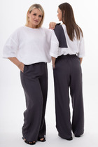 Брюки в стиле палаццо струятся с королевским размахом, подчеркивая женственность и комфорт. Мягкий пояс на резинке обнимает талию, не сковывая движений, а два боковых кармана делают образ не только стильным, но и практичным.