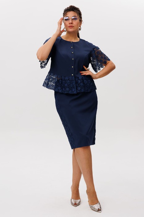 Этот роскошный костюм от Анелли воплощает в себе изысканность и утончённость, создавая образ, достойный самой элегантной женщины. Жакет с полуприлегающим силуэтом подчёркивает женственные линии, а изящные конструкторские решения в области плеча добавляют лёгкую драматичность. Рукав, выполненный из ажурного кружевного полотна, мягко ниспадает, создавая эффект воздушности и благородной нежности. Застёжка на пуговицы по всей длине придаёт строгость и завершённость силуэту, а кружевная баска добавляет ноту романтичности и изящества.