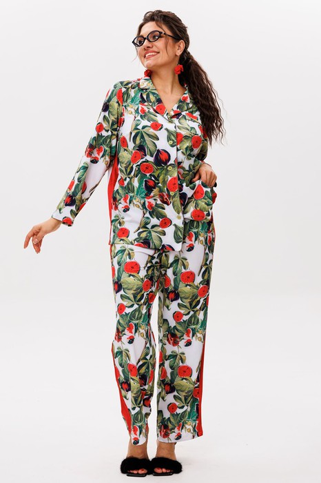 Бархатные лампасы, бегущие по боковым швам, добавляют ноту роскоши и делают силуэт визуально стройнее, а актуальный принт превращает этот комплект в настоящий арт-объект. Он создан не для сна — хотя и в этом он безупречен — а для жизни: для уверенных выходов в город, неформальных встреч и даже романтических свиданий.