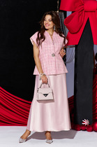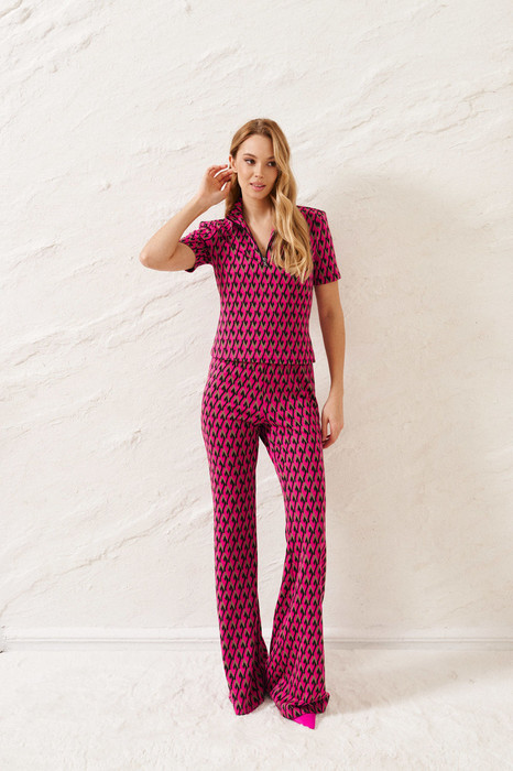 Комплект состоит из джемпера и брюк выполнен из трикотажного полотна с контрастным принтом.Характеристики: джемпер прилегающий силуэт, подплечники, рукав втачной короткий, горловина стойка, застежка по переду изделия - металлическая молния. Длина изделия 51 см, длина рукава 21 см. Брюки прилегающего силуэта, пояс брюк на резинке. Длина брюк 118 см.