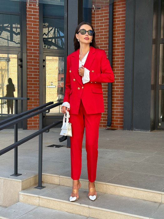 Костюм 2-предметный: жакет и брюки. Двубортный жакет на подкладке, прямого силуэта. Обработаны прорезные карманы по переду. Рукава втачные одношовные, обработаны шлицей.  Брюки прямого кроя, длинна 7/8, застёжка- гульфик , по юоковым вам обработаны карманы