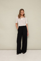 Костюм 2-хпредметный.  Жакет  однобортный свободнго силуэта. Жакет обработан подкладкой. Рукав прямой, длинный, втачной, отрезной с пришитой присборенной деталью, шнурком из основной ткани для завязывания.  Брюки прямого кроя, длинна 7/8, застёжка- гульфик , по боковым швам обработаны карманы