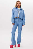 Этот 2-х предметный комплект состоит из жакета и брюк. Жакет - настоящая жечужина в гардеробе. Небанальный вариант застёжки сбоку на лицевой стороне, и потайной пуговицей внутри изделия придаёт жакету характер, подчёркивает силуэт и линию талии. Жакет выгодно акцентирует фигуру, создавая утончённый и женственный образ. Благодаря декоративным рюшам из вуали, он легко станет центральным элементом образа. Карманы с клапанами. Брюки станут глотком свежего воздуха среди широких силуэтов и брюк палаццо. Их облегающий крой подчёркивает линию бедёр и тали, а затем изящно расклешается от колена.Такой фасон позволит скорректировать фигуру и подойдёт для строго дресс кода. Вертикальные линии по центру брючин вытягивают силуэт и удлиняют ноги. Застёжка классическая - молния и пуговица в цвет изделия.