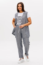 Этот 3-х предметный комплект состоит из жакета, корсетного топа и брюк. Жакет без подкладки, швы обработаны кантом в цвет изделия. Рукав втачной, прямой, одношовный. Воротник шаль. Застежка на притачной пояс, дополнен съёмной пряжкой золотистого цвета. Корсетный топ с открытыми плечами — воплощение чувственной элегантности. Открытые плечи подчеркивают линию шеи и ключиц, а корсетный крой создает безупречный силуэт. Роскошный силуэт и акцентная баска делают его идеальным выбором для особенного вечера. Также топ отлично вписывается в повседневные образы. Брюки станут глотком свежего воздуха среди широких силуэтов и брюк палаццо. Их облегающий крой подчёркивает линию бедёр и тали, а затем изящно расклешается от колена.Такой фасон позволит скорректировать фигуру и подойдёт для строго дресс кода. Вертикальные линии по центру брючин вытягивают силуэт и удлиняют ноги. Застёжка классическая - молния и пуговица в цвет изделия.