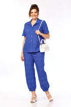 Комплект женский брючный, состоящий из блузки и брюк. Блузка рубашечного покроя с коротким втачным рукавом с манжетой по низу рукава. Свободная, с фигурным низом, комбинированная из двух видов ткани: с вышивкой и однотона. По переду блузки застёжка на планки с пуговицами, воротничок небольшой рубашечный. Брюки "алладины", свободные 7/8 длины, на поясе с эластичной тесьмой, по низу брюк тоже манжета с эластичной тесьмой, свободная. Брюки на подкладке из х/б ткани в тон.