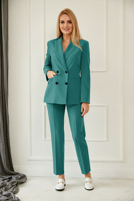 Костюм женский классический, состоит из жакета и брюк. Жакет полуприлегающего силуэта с втачным рукавом, по низу рукава шлица с пуговицами. Спереди два прорезных кармана. По спинке шлица, изделие на подкладке с дизайном (дизайн может меняться). Брюки-зауженные книзу 7/8 длины, с боковыми карманами, на поясе, спереди застегивается на молнию и пуговицы.