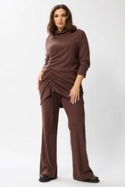 Комплект женский, состоящий из брюк и туники. Туника свободного рубашечного покроя со спущенной проймой и 3/4 рукавом. Застёжка спереди на пуговицы, с боковыми разрезами. Брюки свободные прямые на поясе частично с эластичной тесьмой, с боковыми карманами.