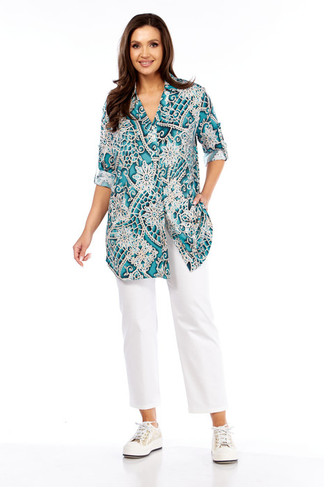 Комплект женский брючный, состоящий из блузки и брюк. Блузка свободного покроя с втачным рукавом 7/8 длины с патой, воротник рубашечный на стойке, с планками под застёжку на пуговицы. Брюки из тогкого джинса с хлопком, эластичного, на поясе, частично с эластичной тесьмой, с карманами и имитаций застёжки, 7/8 длины.