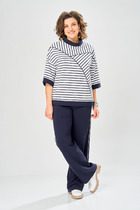 Брюки прямого силуэта, с декоративными хлястиками, застёгивающимися на кнопку, по переду.  Брюки на притачном поясе с резинкой по спинке.