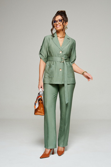 Эффектный костюм состоит из жакета и брюк, выполнен из мягкой смесовой ткани с органическими льном и вискозой, практичен в носке.