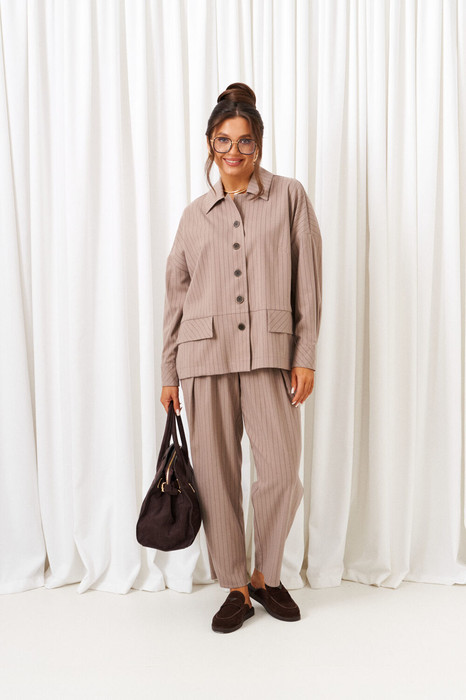 Костюм состоит из 2-х предметов одежды: рубашки и брюк. Выполнен из костюмной ткани стильного дизайна в полоску.